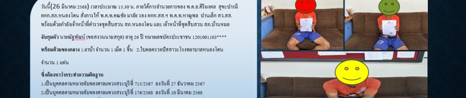 วันนี้(26 มีนาคม 2568) เวลาประมาณ 12.30 … อ่านเพิ่มเติม ชุดสืบสวน สภ.หนองโดน จับกุมผู้ต้องหาพร้อมของกลางยาบ้า ซึ่งเป็นบุคคลตามหมายจับของศาล