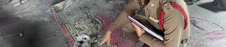 พนักงานสอบสวนออกตรวจสถานที่เกิดเหตุเพลิงไหม้กุฏิพระ