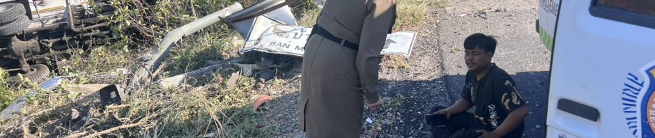 พนักงานสอบสวนตรวจสอบที่เกิดเหตุ อุบัติเหตุรถบรรทุกสิบล้อตกข้างทาง