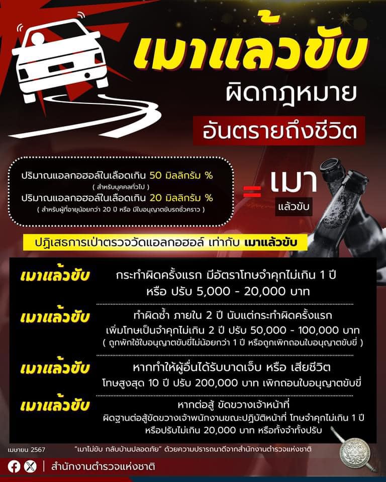 เมาแล้วขับ – หากทำให้ผู้อื่นได้รับบาดเจ็บ หรือ เสียชีวิต โทษสูงสุด 10 ปี ปรับ 200,000 บาท เพิกถอนใบอนุญาตขับขี่