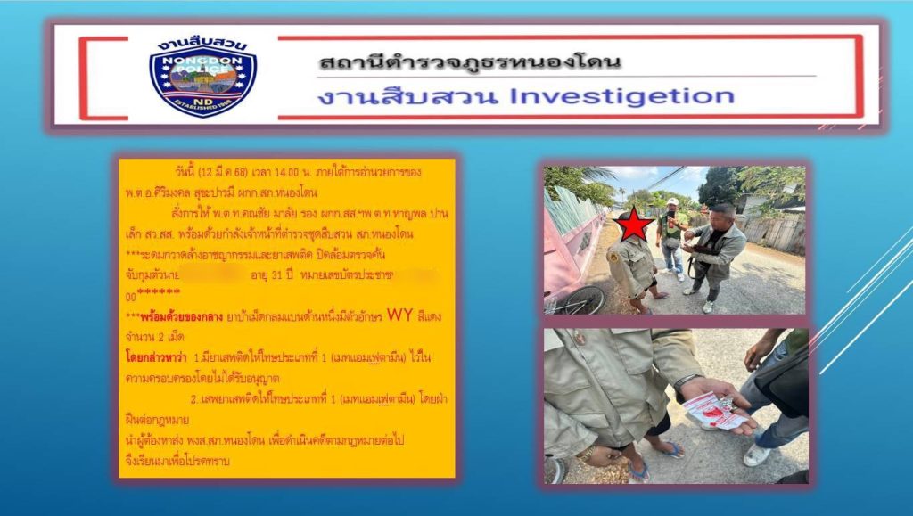 สั่งการให้ พ.ต.ท.คณชัย มาลัย รอง ผกก.สส.ฯพ.ต.ท.หาญพล ปานเล็ก สว.สส. พร้อมด้วยกำลังเจ้าหน้าที่ตำรวจชุดสืบสวน สภ.หนองโดน