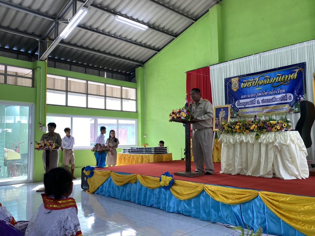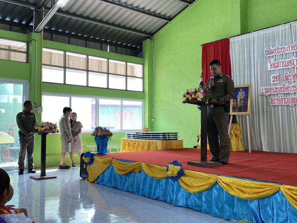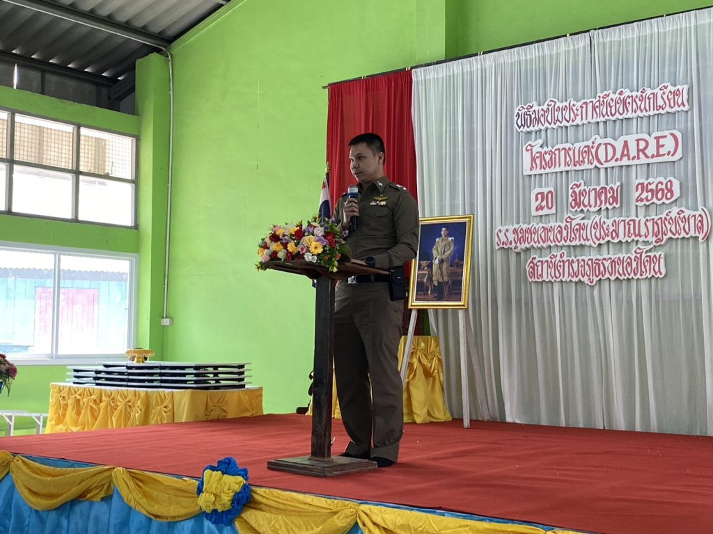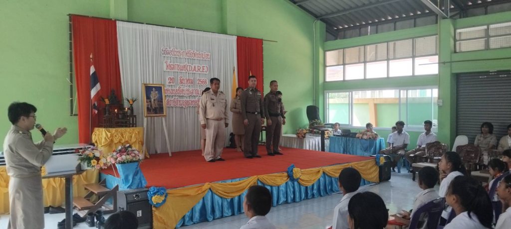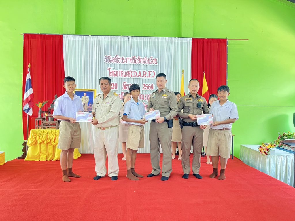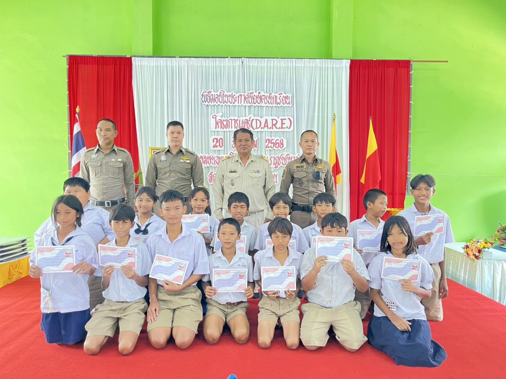 มอบหมายให้ พ.ต.ท.รักศาสน์ สำเร็จ รอง.ผกก.ป.สภ.หนองโดน พ.ต.ท.วิโรจน์ กันตุ่ม สวป.สภ.หนองโดน และด.ต.สามารถ เชิดชู ครูตำรวจแดร์ มอบใบประกาศนักเรียนโครงการ” การศึกษาเพื่อต่อต้านการใช้ยาเสพติดในเด็กนักเรียน(D.A.R.E.) นักเรียนชั้นประถมศึกษาปีที่ 5 โรงเรียน