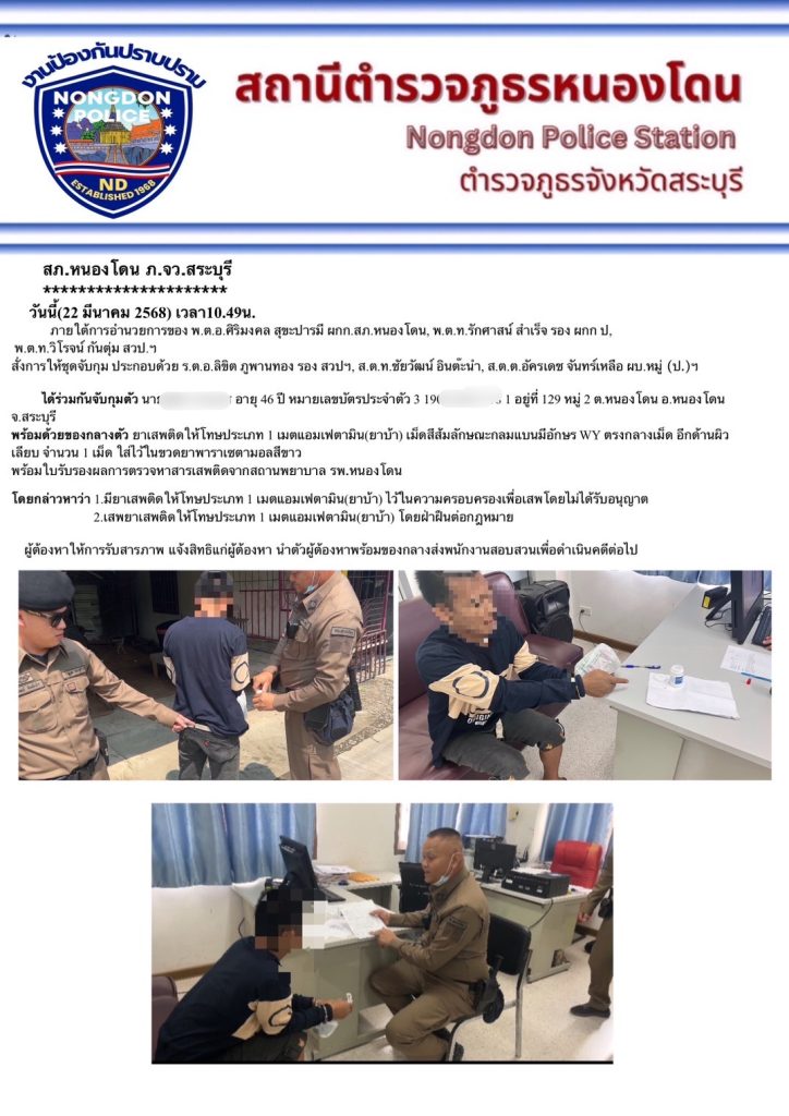 ได้ร่วมกันจับกุมตัว นายสุริยา อายุ 46 ปี หมายเลขบัตรประจำตัว 3 1908 000xxxxx ที่อยู่ ต.หนองโดน อ.หนองโดน จ.สระบุรี