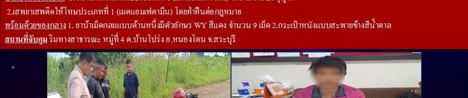 🔺พร้อมด้วยของกลาง 1. ยาบ้าเม็ดกลมแบบด้านหนึ่งมีตัวอักษร WY สีแดงจำนวน 9 เม็ด 2.กระเป๋าหนังแบบสะพายข้างสีน้ำตาล