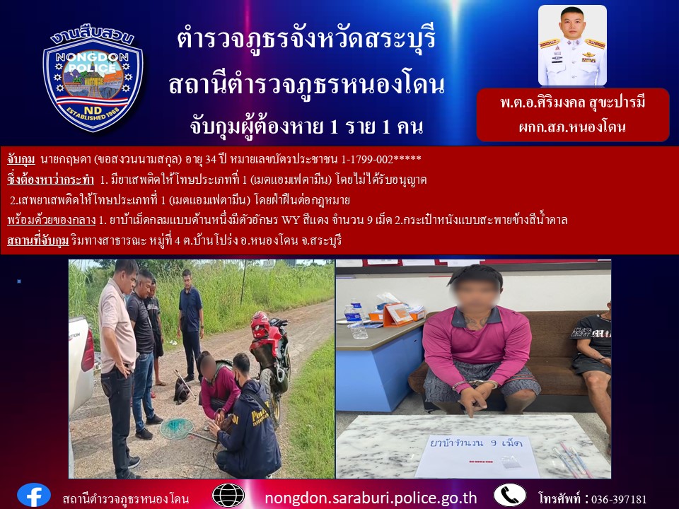 🔺 สถานที่จับกุม ริมทางสาธรณะ หมู่ที่ 4 ต.บ้านโปร่ง อ.หนองโดน จ.สระบุรี
