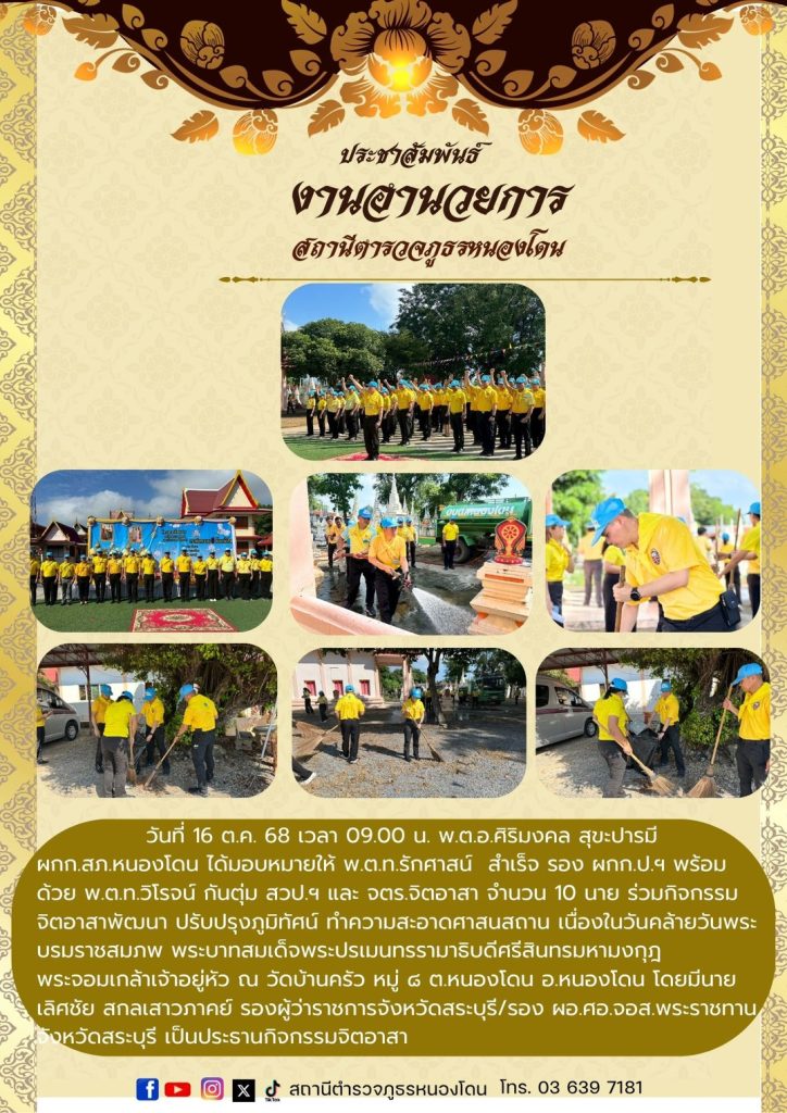 พ.ต.ท.รักศาสน์ สำเร็จ รอง ผกก.ป.ฯ พร้อมด้วย พ.ต.ท.วิโรจน์ กันตุ่ม สวป.ฯ และ ตร.จิตอาสา จำนวน 10 นาย ร่วมกิจกรรมจิตอาสาพัฒนา ปรับปรุงภูมิทัศน์ ทำความสะอาดศาสนสถาน เนื่องในวันคล้ายวันพระบรมราชสมภพ พระบาทสมเด็จพระปรเมนทรรามาธิบดีศรีสินทรมหามงกุฎ พระจอมเกล้าเจ้าอยู่หัว ณ วัดบ้านครัว หมู่ 8 ต.หนองโดน อ.หนองโดน โดยมีนายเลิศชัย สกลเสาวภาคย์ รองผู้ว่าราชการจังหวัดสระบุรี/รอง ผอ.ศอ.จอส.พระราชทาน จังหวัดสระบุรี เป็นประธานกิจกรรมจิตอาสา