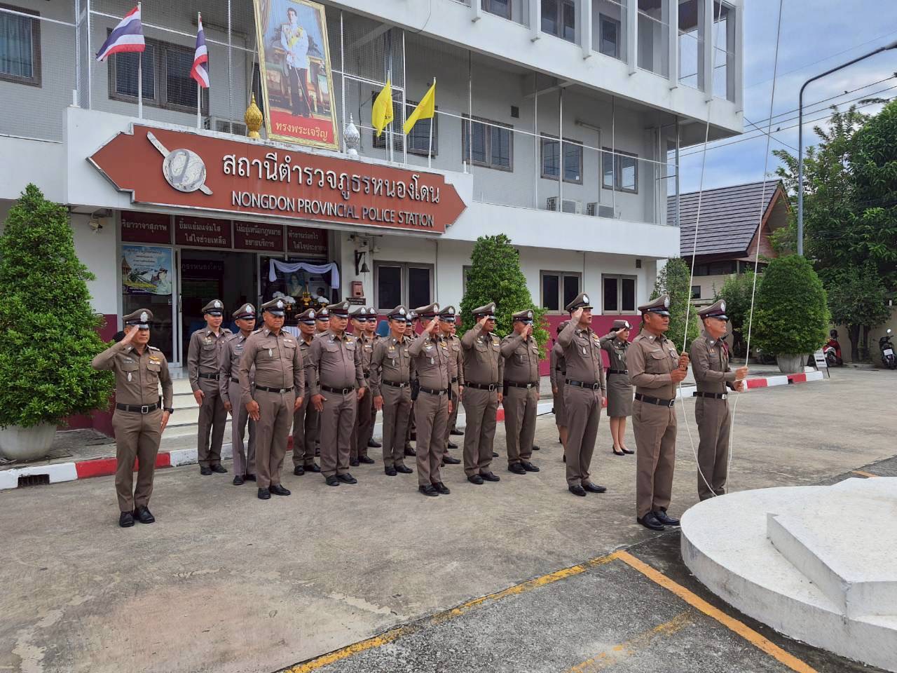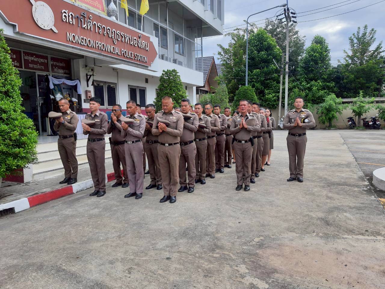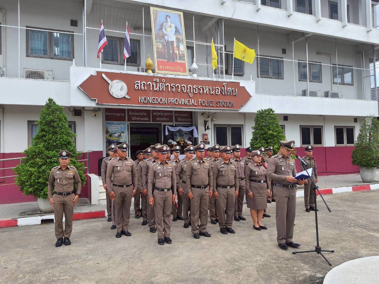 พร้อมข้าราชการตำรวจในสังกัด สภ.หนองโดน โดย ผกก.ฯ ได้นำข้าราชการตำรวจเคารพรงชาติ และกล่าวคำในการร่วมแสดงพลังแห่งความจงรักภักดีต่อชาติ ศาสนา พระมหากษัตริย์ พร้อมกล่าวอุดมคติตำรวจ 9 ข้อ และ”ประกาศเจตนารมณ์เราไม่ใช่องค์กรอาชญากรรม” ณ บริเวณหน้าอาคารที่ทำการ สภ.หนองโดน