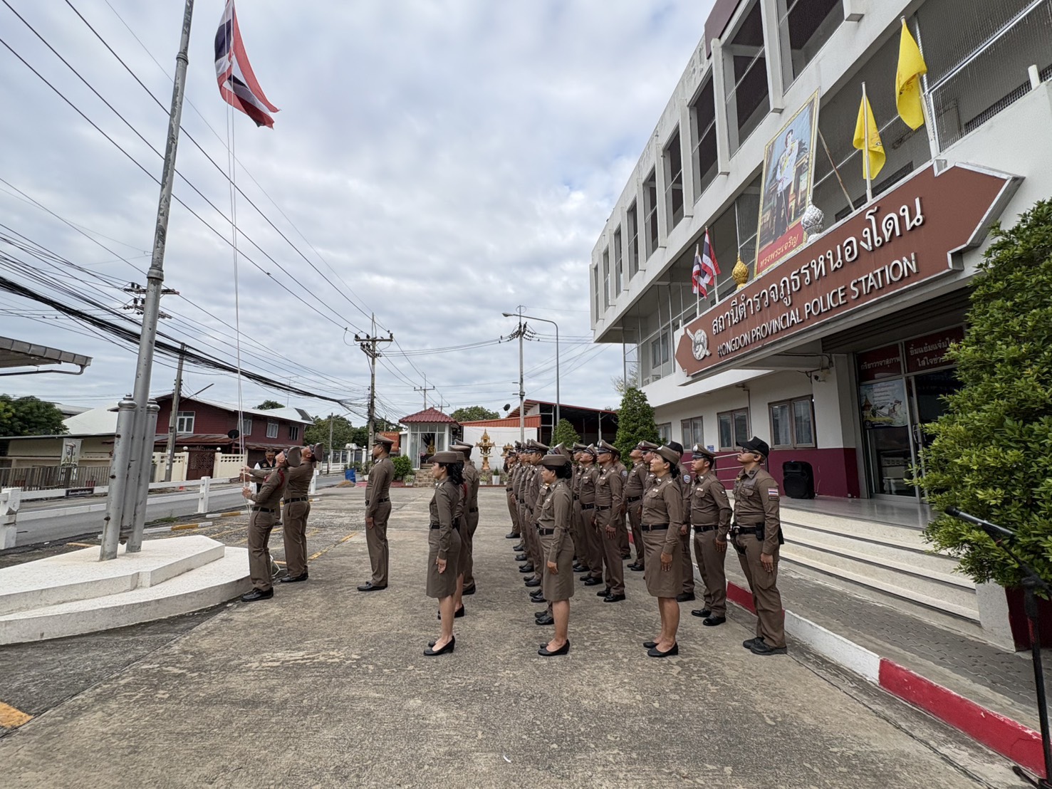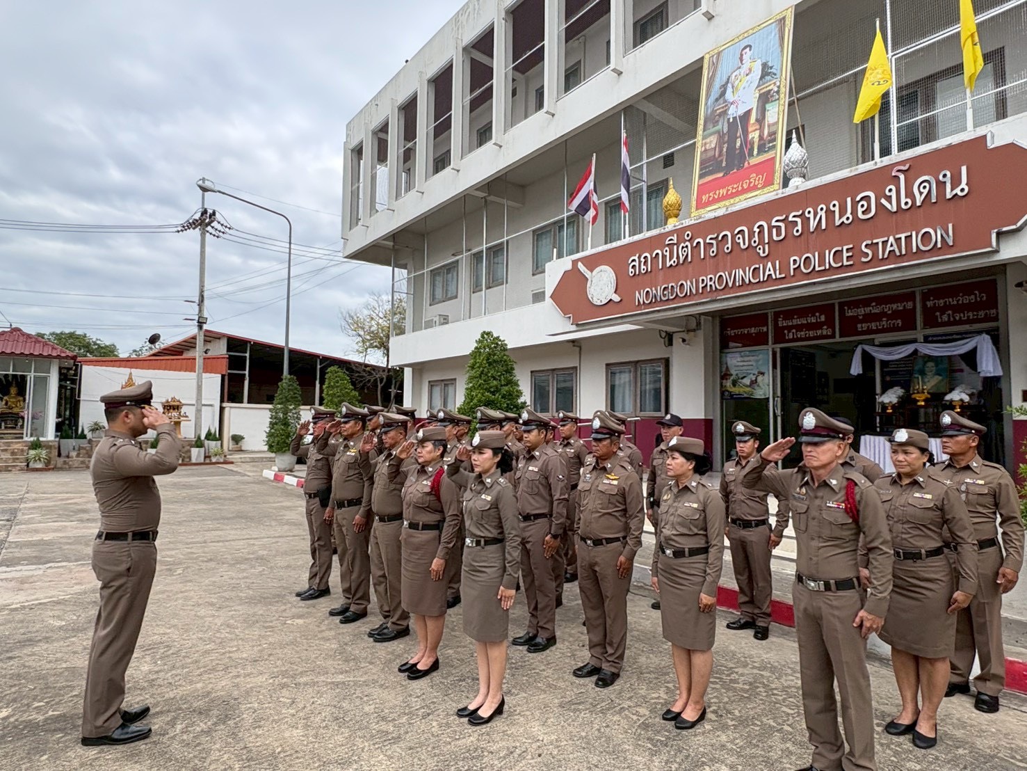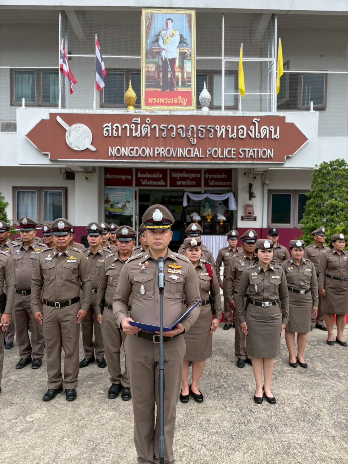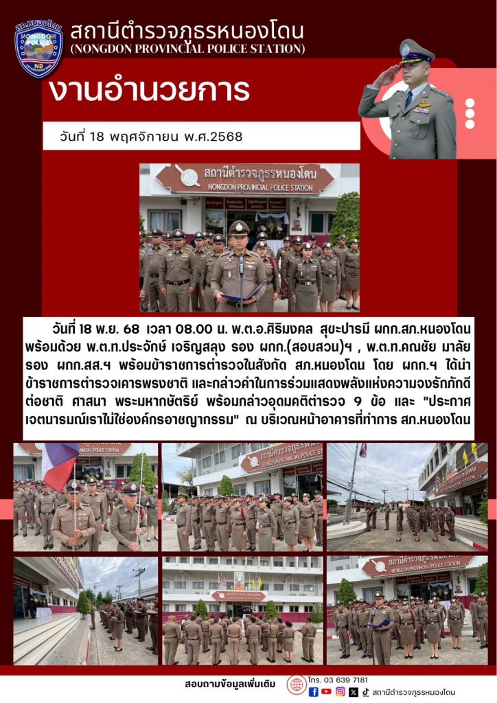 พร้อมข้าราชการตำรวจในสังกัด สภ.หนองโดน โดย ผกก.ฯ ได้นำข้าราชการตำรวจเคารพรงชาติ และกล่าวคำในการร่วมแสดงพลังแห่งความจงรักภักดีต่อชาติ ศาสนา พระมหากษัตริย์ พร้อมกล่าวอุดมคติตำรวจ 9 ข้อ และ”ประกาศเจตนารมณ์เราไม่ใช่องค์กรอาชญากรรม” ณ บริเวณหน้าอาคารที่ทำการ สภ.หนองโดน