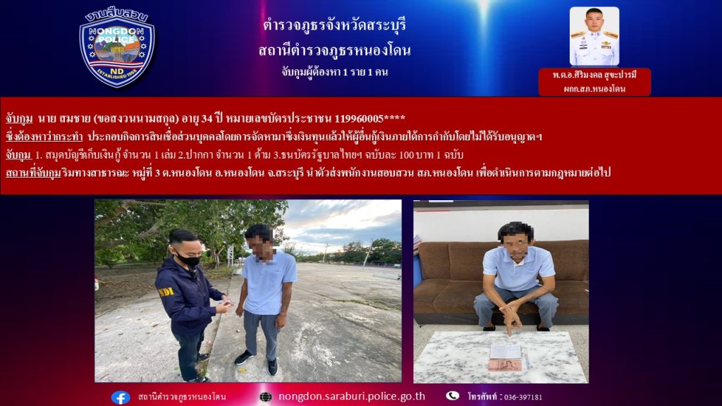 🔺จับกุมตัว นาย สมชาย (ขอสงวนนามสกุล) อายุ 34 ปี หมายเลขบัตรประชาชน 119960005****