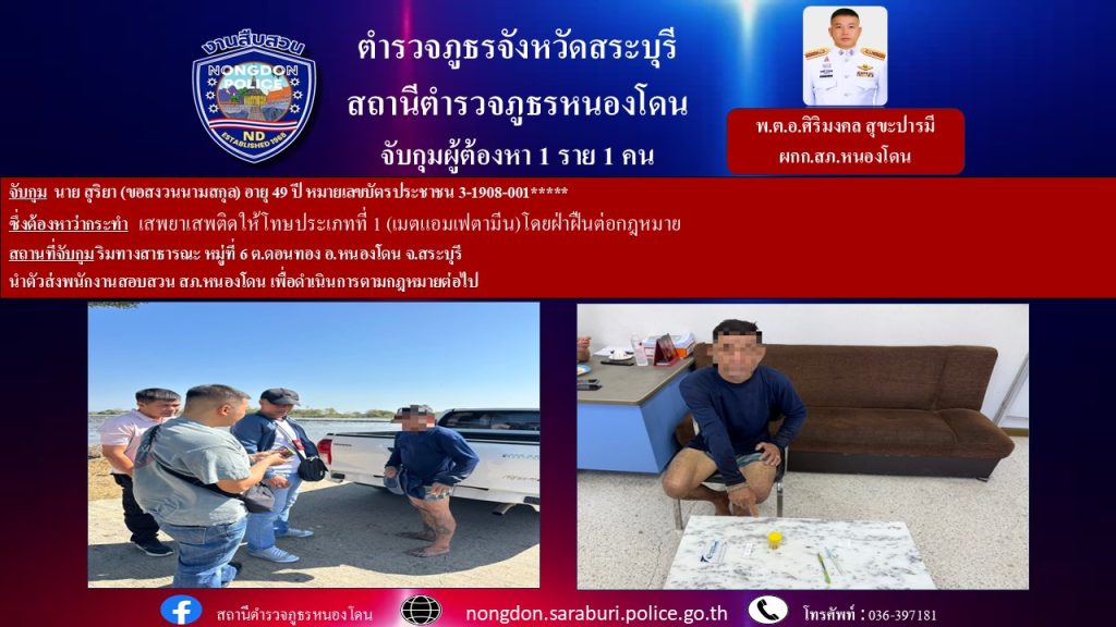 🔺จับกุมตัว นาย สุริยา (ขอสงวนนามสกุล) อายุ 49 ปี หมายเลขบัตรประชาชน 3-1908-001*