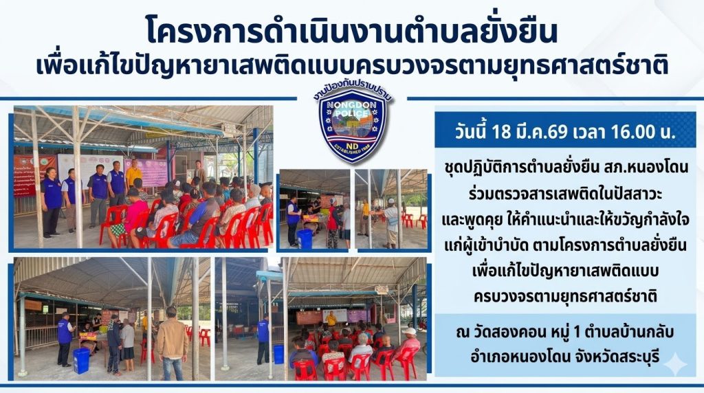 วันที่ 18 มี.ค.69 เวลา 16.00 น. ร.ต.อ.ลิขิต ภูพานทอง รอง สวป.สภ.หนองโดน พร้อมด้วยชุดปฏิบัติการตำบลยั่งยืน สภ.หนองโดน ร่วมตรวจสารเสพติดในปัสสาวะ และพูดคุย ให้คำแนะนำและให้ขวัญกำลังใจ แก่ผู้เข้าบำบัด ตามโครงการตำบลยั่งยืน เพื่อแก้ไขปัญหายาเสพติดแบบครบวงจรตามยุทธศาสตร์ชาติ